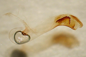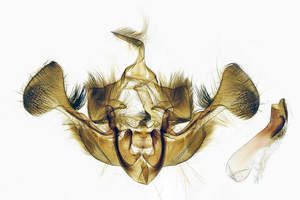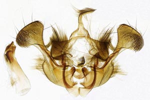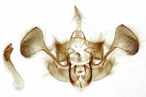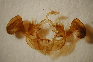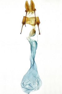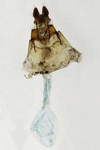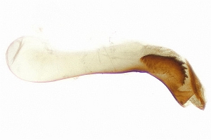 Clavus zapfenförmig, nach oben gerichtet, mit zahlreichen kleinen Dornen besetzt, dunkel (sklerotisiert). Cornutus im Aedoeagus breit, mit rundlich gebogenem Rand, der 5-10 Zähne trägt.