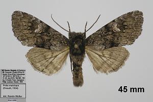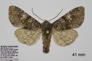 A. malchani sp. n. (14 i) steht der tiefi etwas nahe, ist aber wesentlich stärker grob schwarz bestreut, so daß die Zeichnung viel undeutlicher wird, nur die hintere wellig gezähnte Querlinie tritt deutlicher hervor als bei tiefi und ist unter dem Vrd außen etwas weißlich angelegt; Ringmakel klein und rund, kaum heller als der Grund, schwarz umzogen; die Nierenmakel ist ebenfalls kleiner als bei tiefi, stärker gekrümmt und nach unten kaum die untere Zellecke überschreitend, was bei tiefi viel mehr der Fall ist; sie ist weiß geringt und im schwarzgrauen Kern nochmals mit weißlichem Zentralwisch, Zapfenmakel klein; Wellenlinie schwärzlich, außen heller angelegt. Sehr charakteristisch sind die gleichmäßig braungrauen Hflgl, die außer einem Diskalhalbmond zwei dunkler braungraue Schattenbinden postmedian und subterminal tragen. Vor den Fransen eine braungraue Saumlinie, Fransen selbst hell bräunlichgrau mit dunkler Teilungslinie. Die ♂-Fühler tragen kürzere Kammzähne als bei tiefi, die stumpfer enden als dort und so dicht stehen, daß der Zwischenraum zwichen [sic] 2 Zähnen höchstens halb so breit als der einzelne Zahn ist, bei tiefi stehen sie viel weiter auseinander, so daß hier der Zwischenraum doppelt so breit als der einzelne Zahn ist. Südwestliches Transbaikalien (Malchan-Berge); nach 2 ♂♂, Typen in coll. Bang-Haas.“