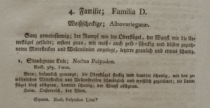 Nach Hemming (1937: 178) wurden die Seiten 155-178 von Hübners Ziefer-Band im Zeitfenster vom 13. März 1814 bis zum 20. April 1823 publiziert. Somit ist unklar, ob Ochsenheimer (1816) der Text von Hübner über Noctua polyodon bereits vorgelegen hat. Auf jeden Fall konnte Ochsenheimer (1816) Hübners Abbildung von Noctua polyodon sehen, denn diese ist nach Hemming (1937: 256) im Zeitraum Juli 1803 bis 1808 erschienen.