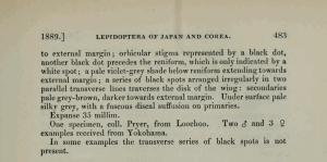 - Original description: Leech, J. H. (1889): On the Lepidoptera of Japan and Corea.–Part III. Heterocera, Sect. II. Noctues and Deltoides. — Proceedings of the Scientific Meetings of the Zoological Society of London for the Year 1889: 474-571, pl. L-LIII. London (Longmans, Green, and Co.).