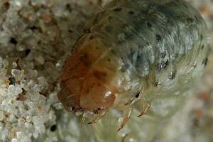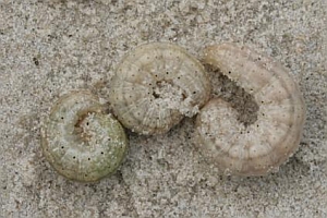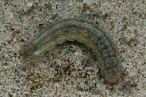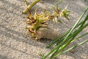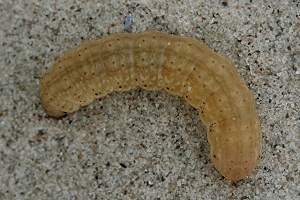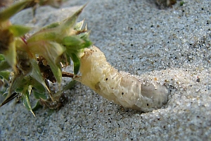 1-2: Dänemark, Møn, Klintholm Havn, Sandstrand, Raupe im Sand unter einzeln stehender Salsola kali-Staude, leg. 27. August 2007 (Studiofotos am 9. September 2007: Franziska Bauer), leg. & cult. Franziska BauerForum