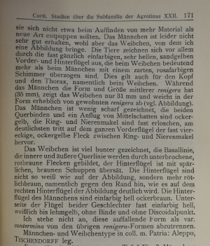 - Erstbeschreibung: Corti, A. (1929): Studien über die Subfamilie der Agrotinae XXII. (Lep.). — Deutsche Entomologische Zeitschrift „Iris“ 43 (1): 169-175, pl. 5.
