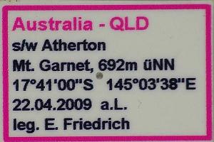 Lane (1995: 115): “QUEENSLAND: Holotype ♂, Wolfram Camp, 27 kom NW of Dimbulah, bred ex pupa, 10.iv.1993, D.A. Lane, in Australian National Insect Collection (ANIC), Canberra.” — Paratypes: 55 ♂♂ and 23 ♀♀.