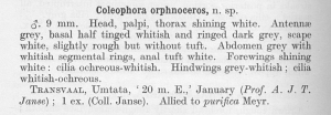 Meyrick (1937: 130) beschrieb seine neue Art nach einem einzelnen Männchen mit Daten "Transvaal, Umtata, '20 m. E.,' January (Prof. A. J. T. Janse); 1 ex (Coll. Janse)." Weitere Funde scheint es bisher nicht zu geben.
