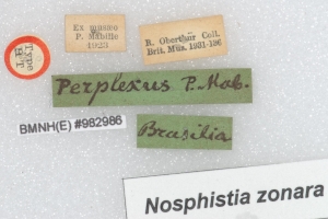 19-21: Lectotypus ♂ von Pyrrhopyga [sic] perplexus Mabille, 1878, Daten siehe Etiketten (fot.: Nick V. Grishin, Fotos bearbeitet: Michel Kettner), © Images copyright Trustees Natural History Museum, used with permission.