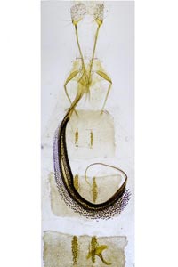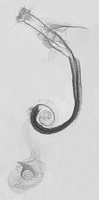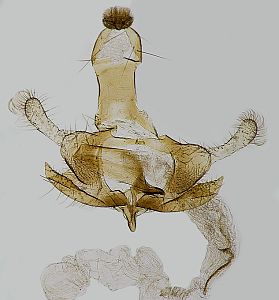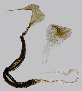 “Coleophora paucinotella Toll, 1961 – gamandorevõ zsákosmoly – Following Baldizzone’s study (pers. comm.) of the distinguishing of two closely related species of Coleophora paucinotella and C. auricella (Fabricius, 1794) it was found that all specimens examined from Hungary previously identified as auricella really belong to paucinotella. It seems that C. auricella does not occur in Hungary, but in order to be sure much more material have to be studied.”
