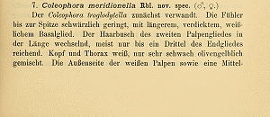 - Baldizzone, G. (1978): Contribuzioni alla conoscenza dei Coleophoridae VIII. Le femmine di Coleophora ravillella Toll, C. filaginella Fuchs, C. meridionella Rbl., C. palaestinella Toll. — Entomologica 14: 31-40. Bari. [Zum PDF auf ojs.cimedoc.uniba.it]