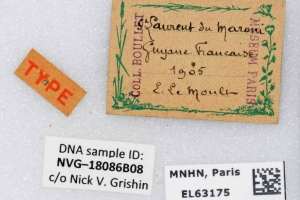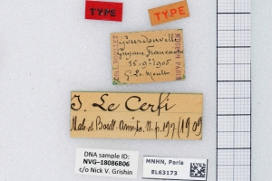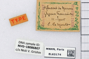 13-15: Lectotypus ♂ von Jemadia lecerfi Mabille, 1912, Daten siehe Etiketten (fot.: Nick V. Grishin, Fotos bearbeitet: Michel Kettner), coll. Muséum national d'histoire naturelle. Paris.
