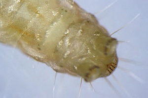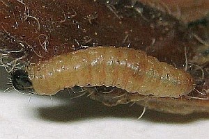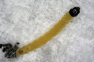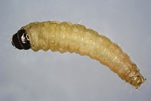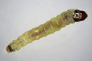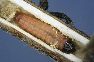 Kennel (1913: 277) sammelte alle richtigen und falschen Angaben zusammem: "Die Raupe ist bräunlichweiß bis grünlichgelb, Kopf und Nackenschild sind schwärzlich bis schwarz, die Analklappe ist bräunlich. Sie lebt vom September bis zum Frühling im Stengel, meist in dessen oberem Teil von Mentha piperacea, aquatica, sylvestris, hirsuta, Alisma plantago, Butomus, Lycopus, Inula, in zweiter Generation im Juni". Die Angaben zu Alisma, Butomus und Inula sind dabei sicher falsch.