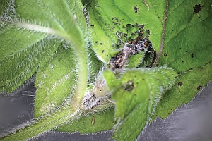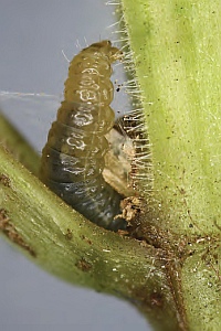 Budashkin (2009: 264) meldet: “Гусеница отмечена в середине июня - третьей декаде июля в скрученных листьях мяты перечной (Mentha piperita L.).” [Die Raupe wurde Mitte Juni bis zur dritten Julidekade in den gekräuselten Blättern der Pfefferminze (Mentha piperita L.) beobachtet.]