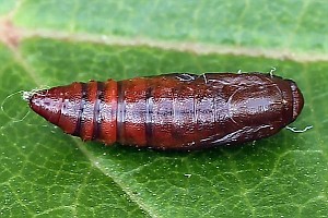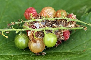Bereits Hübner (1809) bildet die Raupe in seiner Erstbeschreibung der Art auf der Frucht einer Stachelbeere ab. Schütze (1931) meldet: "In den unreifen Beeren der Stachel- und Johannisbeere, ist leicht zu entdecken durch das zwischen den Beeren angelegte Gespinst und durch deren frühzeitiges Reifen. Verwandlung in der Erde (Sorhagen)." Die oben gezeigten Raupenfunde von A. Ponomarev erfolgten an Roten und Schwarzen Johannisbeeren.