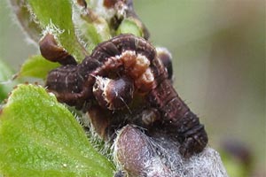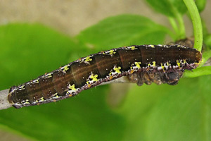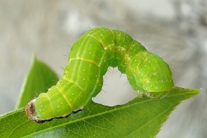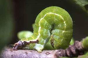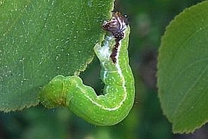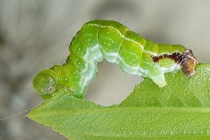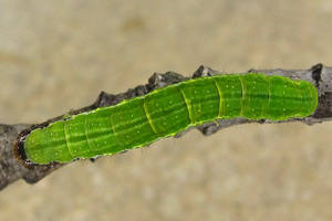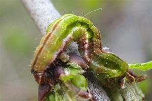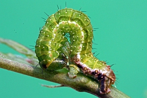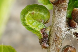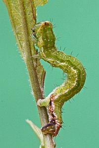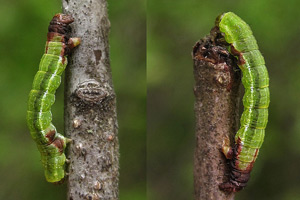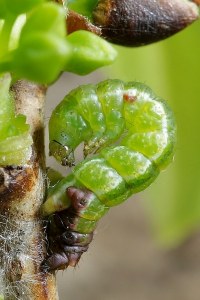 Rhamnus cathartica (Gewöhnlicher Kreuzdorn): Der Verfasser dieser Zeilen fand in Südwestdeutschland schon einige Dutzend Raupen – immer an Gewöhnlichem Kreuzdorn und meist an kniehohen bis alten Büschen in meist besonnter und warmer Lage. Die Raupen sitzen frei, also nicht wie bei Hausmann & Viidalepp (2012) angegeben zwischen zusammengesponnenen Blättern, fast stets auf den Spitzentrieben. Bergmann (1955) beschrieb ganz richtig: „Die Raupe lebt einzeln oder in kleinen Gruppen frei an Kreuzdorn (Rhamnus cathartica). Sie ist in Mitteldeutschland meist grasgrün gefärbt und hat hochrote Seitenflecken. Sie lässt sich von M. 5 bis M. 6 klopfen.