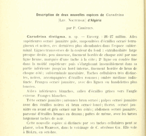 - Erstbeschreibung: Chrétien, P. (1913): Description de deux nouvelles espèces de Caradrina (Lep. Noctuidae) d'Algérie. — Bulletin de la Société entomologique de France 1913: 282-284. Paris.
