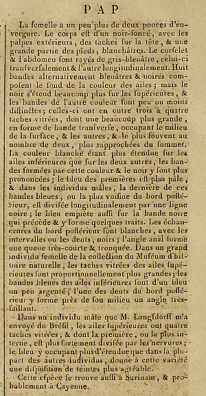 - Erstbeschreibung: Latreille [1824]: Encyclopédie méthodique. Histoire naturelle. Entomologie, ou histoire naturelle des crustacés, des arachnides et des insectes 9 (2): 329-828. Paris (Agasse).