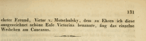 Die Deutung von Spuler (1908: 284L) „victorina Siegerin, d.h. über die anderen Arten; wegen ihrer Schönheit“ trifft nicht zu, denn Sodoffsky (1849: 131) widmete die Art seinem Freund Victor von Motschulsky, der das beschriebene Weibchen gefangen hatte.