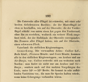 - Erstbeschreibung: Eversmann, E. (1854): Beiträge zur Lepidopterologie Russlands, und Beschreibung einiger anderer Insecten aus den südlichen Kirgisensteppen, den nördlichen Ufern des Aralsees und des Sir-Darja's. — Bulletin de la Société impériale des naturalistes de Moscou 27 (3): 174-205, pl. I. Moscou (Imprimerie de l'Université Impériale).
