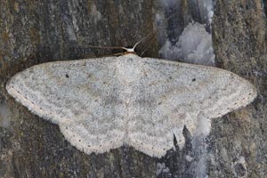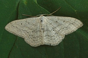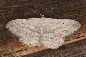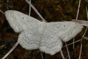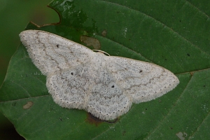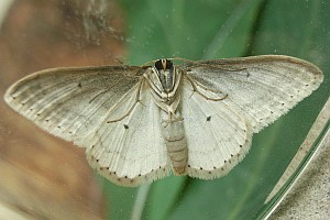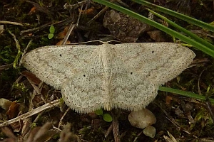 Scopula marginepunctata hat dunkle Saumflecke; der rote Pfeil zeigt auf den unteren der beiden besonders markanten mittleren Flecke am Vorderflügel.