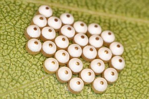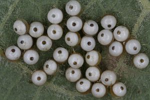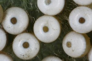 1: Eispiegel an der Unterseite eines Buchenblatts: Deutschland, Baden-Württemberg, südlicher Odenwald, Dilsbergerhof bei Neckargemünd, am Rande eines Laubmischwalds, 4. Juni 2006 (Foto: Jutta Bastian), det. Markus Schwibinger & Thomas FähnrichForum