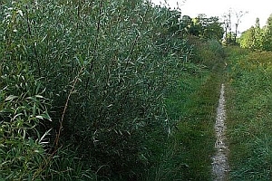 1: Gebüschsaum mit Knackweidenbüschen (Salix fragilis) auf einem sonnenexponierten Damm vor einem Gewässer im NSG Petite Camargue. An den unteren Blättern im Schatten des Busches habe ich schon zum zweiten Mal erwachsene Raupen gefunden: Frankreich, Elsass, Village Neuf, NSG Petite Camargue, 240 m, 2. September 2006 (Foto: Florian Nantscheff)Forum