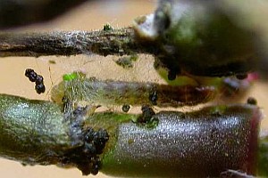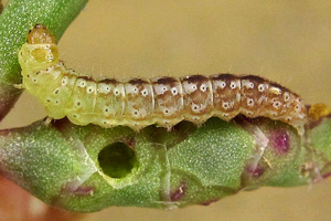 Vom oben gezeigten Fundort nahm ich Pflanzen beider Arten (Salicornia europaea und Salsola kali) mit nach Hause. An den Quellerpflanzen konnte ich deutlich Spuren von Schabefraß und Raupenkot finden. Die Zucht war aufgrund der Ansprüche der Raupennahrungspflanzen ziemlich schwierig. Es ging einigermaßen, wenn der Queller in einer geräumigen Plastschachtel auf eine angefeuchtete Küchenkreppunterlage gelegt wurde. Es mussten dann allerdings in der ersten Zeit etwa alle drei bis vier Tage neue Pflanzen besorgt werden. Als die Raupen größer waren, haben sie Kalisalzkraut gefressen. Das Kraut hat sich länger in der Vase gehalten.