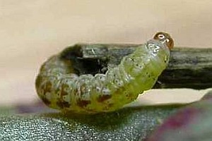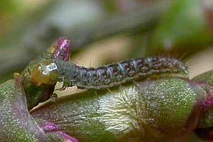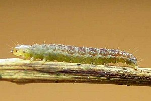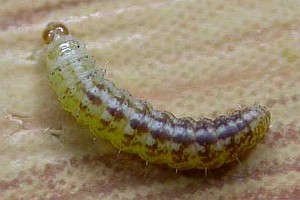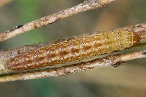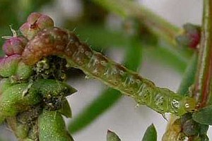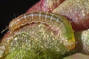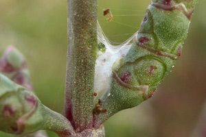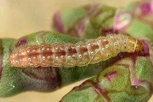 Die kleine, etwa 5 mm lange Raupe fertigt sich zwischen Pflanzenteilen einen Gespinstschlauch an. In der ersten Zeit wird die Pflanze nur durch Schabefraß angefressen. Die ausgewachsene Raupe hat eine Länge von etwas über 1 cm. Offenbar nutzt sie ihre Tarnfärbung, indem sie sich mit dem rötlichen Hinterleib an den jetzt ebenfalls rötlich werdenden Blütenknospen des Kalisalzkrautes festhält, während der grüne Rest auf den Blättern kaum zu sehen ist. Die Blätter werden ausgefressen.