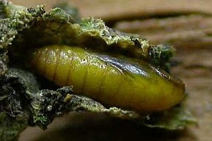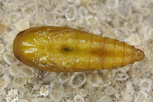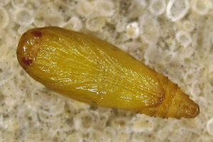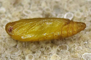Zum Verpuppen fertigte sich die Raupe (in der Zucht) zwischen ausgefressen und vertrockneten Pflanzenresten einen kleinen Kokon an. Dieser wird von der Puppe fast vollständig ausgefüllt.