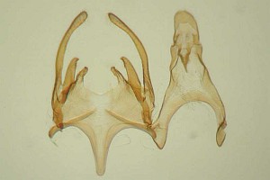 Zur Orientierung: Die paarigen, länglichen Fortsätze am Valven-Vinculum-Komplex sind (von außen nach innen): Valve, Sacculus, Vinculum-Fortsatz.