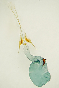 Scrobipalpa nitentella: Sacculus gegen die Spitze verschmälert, deutlich länger als der Vinculum-Fortsatz. Bei aufgerollten Genitalien (=Standard-Präparation) bilden der zentrale Einschnitt des Vinculums und die Vinculum-Fortsätze etwa eine Mittelform zwischen einem U und einer oben offenen Raute.