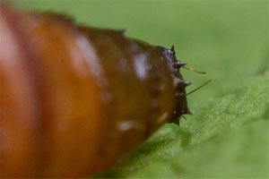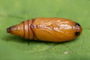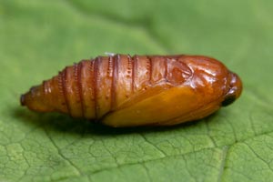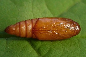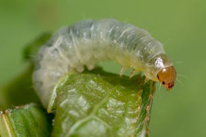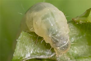 Kennel (1916: 499-500) trug zusammen: "Die Raupe ist jung grünlichweiß, später weißlich, der Kopf blaßbraun, Nacken- und Analschild sind kaum von der Körperfarbe verschieden; sie lebt im April und Mai an Prunus padus an den jungen Herzblättern unter umgeklapptem Rand."
