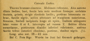 - Erstbeschreibung der Unterart C. l. fittkaui: Müller, G. C., Kravchenko, V. D., Witt, T. J., Junnila, A., Mooser, J., Saldaitis, A., Reshöft, K., Ivinskis, P., Zahiri, R. & W. Speidel (2008): New underwing taxa of the section of Catocala lesbia Christoph, 1887 (Lepidoptera, Noctuidae). — Acta Zoologica Lituanica 18 (1): 33-52.