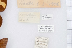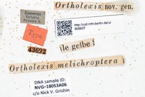 1-3: Holotypus ♂ von Ortholexis dimidia (Holland, 1896), Daten siehe Etiketten (fot.: Nick V. Grishin, Fotos bearbeitet: Michel Kettner), coll. Zoologisches Museum der Humboldt-Universität zu Berlin.