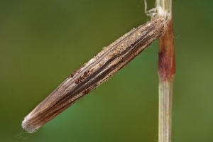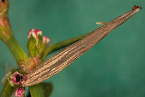 Baldizzone (2019) berichtet zur Raupe: "Basato su Marek, 1996 e successive informazioni; la descrizione della larva è dell'Autore. Piante nutrici: Polygonum aviculare (Polygonaceae). [...] La larva è stata scoperta da Marek in piena attività a settembre e inizio ottobre; essa si nutre dei semi d i Polygonum aviculare penetrando nella capsula dopo averne perforato la parete esterna. Probabilmente tutto lo sviluppo larvale avviene nel periodo autunnale e la larva sverna completamente nutrita, schiudendo ad agosto dell'anno successivo." Polygonum aviculare ist allerdings sehr viel weiter verbreitet als diese an heiße Standorte gebundene Art. Die Arbeit von Marek (1996) konnte ich noch nicht studieren. Attila Takács züchtete die Art ebenfalls erfolgreich mit Polygonum aviculare (siehe Bilder oben).