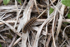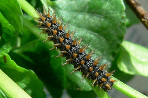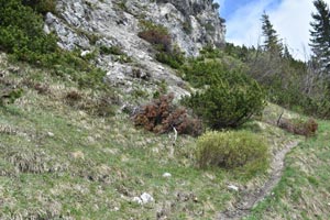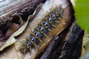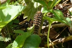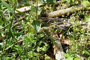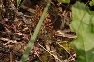 Bild 3 vermittelt einen strukturellen Eindruck des Larvalhabitats. Die Raupennahrungspflanze Viola riviniana ist eher versteckt in der unteren Bildmitte zu erkennen, noch versteckter die mit dem Kopf nach oben ruhende, halbwüchsige Fabriciana adippe-Raupe.