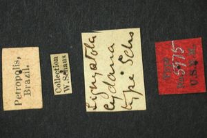 1-3: Syntypus ♂ von Lignyostola cydana Schaus, 1902, Daten siehe Etiketten (fot.: Bernard Hermier, Fotos bearbeitet: Michel Kettner), coll. National Museum of Natural History, Washington, D.C., USA.