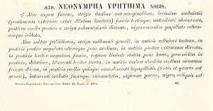 - Erstbeschreibung: Felder & Felder (1864-1867): Reise der österreichischen Fregatte Novara um die Erde in den Jahren 1857, 1858, 1859 unter den Befehlen des Commodore B. von Wüllerstorf-Urbair. Zoologischer Theil. Zweiter Band. Zweite Abtheilung: Lepidoptera. I-VI, 1-549. Wien (Kaiserlich-königliche Hof- und Staatsdruckerei).