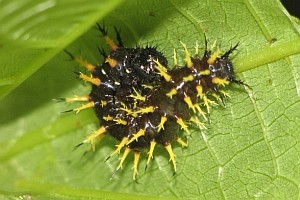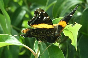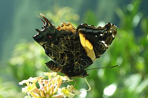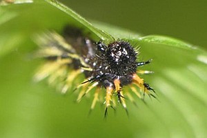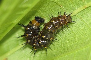 Ähnlich wie Vanessa atalanta ernährt sich die Raupe auch von Urticaceae und spinnt sich in Blatttüten ein, die allerdings unter dem Blatt gerollt werden. (Georg Paulus)