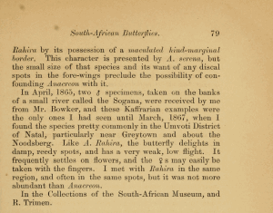 - Erstbeschreibung: Trimen, R. (1868): On some undescribed Species of South-African Butterflies, including a New Genus of Lycænidæ. — The Transactions of the Entomological Society of London for the Year 1868 (1): 69-96, pl. V-VI.