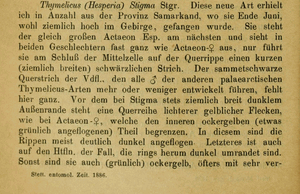 - Erstbeschreibung: Staudinger, O. (1886): Centralasiatische Lepidopteren. (Schluß.). — Entomologische Zeitung 47 (7-9): 225-256. — Digitalisat auf biodiversitylibrary.org: [252]