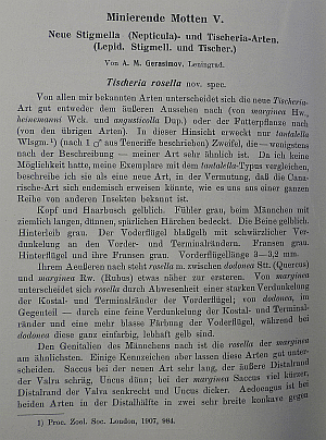 - Erstbeschreibung: Gerasimov, A. M. (1937): Minierende Motten V. Neue Stigmella (Nepticula)- und Tischeria-Arten. (Lepid. Stigmell. und Tischer.). — Mitteilungen aus dem Zoologischen Museum in Berlin 22: 282-285.