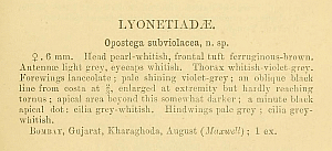 - Opostega subviolacea Meyrick, 1920 [Originalkombination (bis zur Neukombination durch Puplesis & Robinson (1999: 45))]