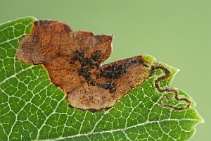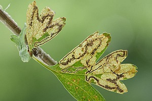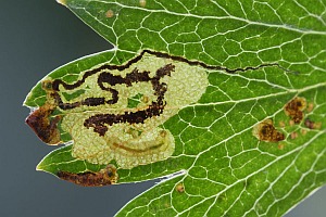Nach Johansson et al. (1990) minieren die Raupen in Skandinavien nur in Blättern von Weißdorn-Arten (Crataegus spp.), in Mitteleuropa hingegen auch an Mehlbeere (Sorbus aria), Elsbeere (Sorbus torminalis), Felsenbirne (Amelanchier ovalis) und Zwergmispel (Cotoneaster sp.).