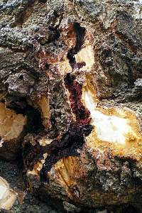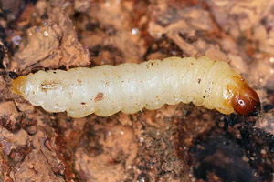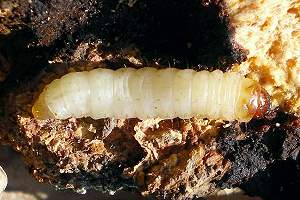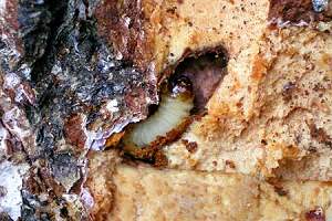 Synanthedon scoliaeformis hat einen 3-jährigen Entwicklungszyklus, und die beste Zeit zur Suche dieser Art ist etwa Mitte Mai, wenn die Raupen mit ihrem Kokonbau fertig sind. Dann werden durch Bearbeiten der Birkenrinde mit der Drahtbürste die Deckel der Schlupflöcher entfernt, die Borke mit dem Stechbeitel ringsherum eingekerbt und ein Stück Rinde samt Kokon vorsichtig heraus gebrochen. Mit etwas Gefühl geht das, ohne Baum und Raupe/Puppe zu verletzen. Zwar ließen sich die Raupen auch im Winter suchen, doch ist es wesentlich aufwändiger und wegen der stärkeren Beschädigung des Baumes nicht ratsam. Man beginnt im Vorfeld, geeignete Bäume zur späteren Untersuchung in seiner Umgebung aufzuspüren. Das sind alte kränkliche Bäume, deren schlechte Verfassung durch Blick in die Krone auch in der laublosen Zeit erkennbar ist. Diese Stämme untersuchen wir zuerst auf einen Befall durch unsere Sesie, der sich durch das Vorhandensein von alten Schlupflöchern, kreisrund und ca. 5 mm im Durchmesser, bemerkbar macht. Die Art neigt zur so genannten Brutbaumbildung, und innerhalb eines Quadratkilometers kann es durchaus nur dieser eine Baum sein, der dutzende, ja hunderte Löcher aufweist, während viele andere Bäume keine oder nur ganz wenige Spuren haben. Bei sehr starkem Befall finden sich die Löcher bis in drei Meter Höhe; normalerweise sind es die unteren 50 cm. Fraßmehlspuren, grobkörnig und meist rotbraun, in den tiefen Rindenritzen sind ein untrügliches Zeichen aktueller Raupentätigkeit. Bis zu den ersten warmen Märztagen überwintert die erwachsene Raupe in einem leichten Gespinst nahe der Stelle, an der sie dann von innen das Schlupfloch fertig stellt (dünner Rindendeckel bleibt stehen) und sich dann dahinter in einem etwas festeren Kokon verpuppt. Aufgebürstete, neue Schlupflöcher erkennen wir sofort am dicht dahinter liegenden, mit groben rotbraunen Partikeln besponnenen Kokon. [Frank Rämisch]
