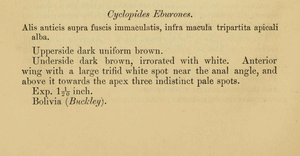 - Erstbeschreibung: Hewitson, W. C. (1877): Descriptions of twenty-three new Species of Hesperidae from his own Collection. — The Annals and Magazine of Natural History, Zoology, Botany, and Geology. Fourth Series 20: 319-328. London (Taylor and Francis). — Digitalisat auf biodiversitylibrary.org: [324]