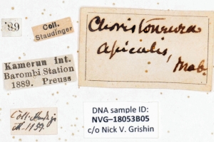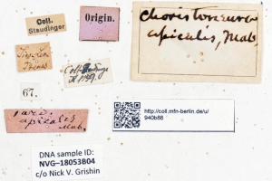 1-3: Typus? (vermutlich Holotypus) ♂ von Choristoneura apicalis (Mabille, 1889), Daten siehe Etiketten (fot.: Nick V. Grishin, Fotos bearbeitet: Michel Kettner), coll. Zoologisches Museum der Humboldt-Universität zu Berlin.