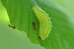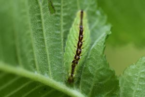 1: typisch für die w-album Raupe ist Lochfrass an den Blättern, Deutschland, Bayern, München, Freimann, 1. Mai 2016 (Foto: Markus Dumke)Forum