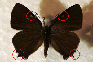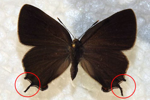 Männchen: Duftschuppen-Fleck auf Vorderflügeln, kurze untere Schwänzchen.