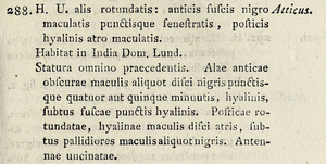 - Erstbeschreibung: Fabricius, J. C. (1793): Entomologia systematica emendata et aucta. Secundum classes, ordines, genera, species adjectis synonimis, locis, observationibus, descriptionibus 3 (1): 1-487. Hafniae (C. G. Proft). — Digitalisat auf biodiversitylibrary.org: [339]