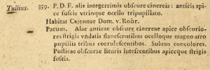 - Erstbeschreibung: Fabricius, J. C. (1787): Mantissa insectorum sistens eorum species nuper detectas adiectis synonymis, observationibus, descriptionibus, emendationibus. Tom. II. Hafniae (Christ. Gottl. Proft): 1-382. [Digitalisat auf archive.org]