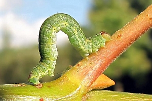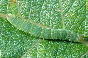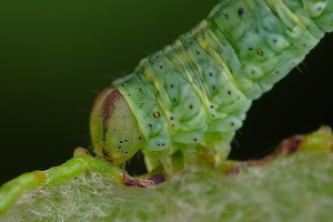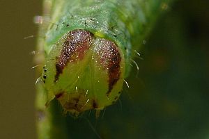 Die Raupe kann man gut an ihrer V-förmigen Kopfkapselzeichnung erkennen. (Stefan Ratering) [Forum]