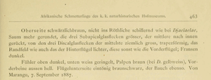 - Erstbeschreibung: Rogenhofer, A. F. (1891): Afrikanische Schmetterlinge des k. k. naturhistorischen Hofmuseums. II. — Annalen des k. k. naturhistorischen Hofmuseums 6: 455-466, pl. XV. — Digitalisat auf biodiversitylibrary.org: [462]